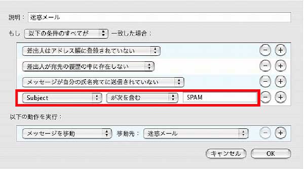 を含む場合は迷惑メールと判定するように設定します。