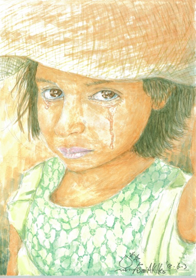宅下げした絵を見ながらの面会。「ロヒンギャ難民を生きる少女」というタイトルの、涙があふれ出る少女を見つめた作品だ。「涙を描くのが難しかった」と文昭。戦火を生きる少女の悲しみが伝わってくるいい絵だ。文昭は「暁子に喜んでもらえると思って描いたんだ」と言った。