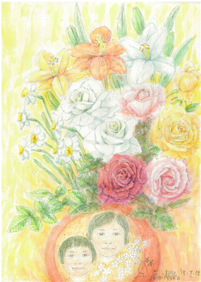 文昭が描いた「母伸子、暁子を描いた花瓶に母を悼む花々を」の絵を見ながらの面会だ。「花瓶の絵柄に暁子とお母さんが写っているんだ。バラと水仙は暁子の家の庭に咲いていたんだ。暁子とお母さんは、小学校の時の集合写真を見て描いたよ」と文昭。聡明な母と勝気な表情の私が描かれている。
