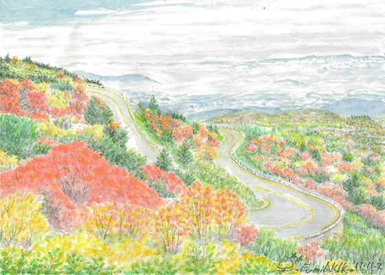 『紅葉のスカイラインから福島盆地を見る』というタイトルの絵が宅下げされた。「前回の福島の野菜の絵は時間がない中で描いたので、今回もう一度福島の風景を描いてみたよ。一年に一回はちゃんと福島の絵を描いておきたいからね。僕の絵らしく黄色を使ってみたんだ」と文昭。明るく華やいだ風景画になった。