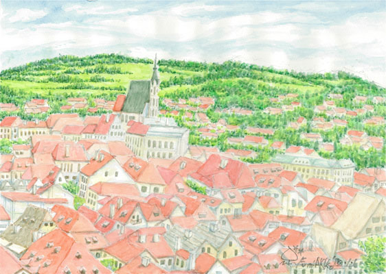 文昭が宅下げした絵「世界は一つ、チェコの街並み」を見ながら話した。文昭は「デッサンに6割力を注いだ」「『ヨーロッパの遺産』の写真集を見ながら描いた」「雅美ちゃんがドイツのクルドさんと結婚して、ドイツに住むというからね。国際連帯は進んでいるよ」と言っていた。 |