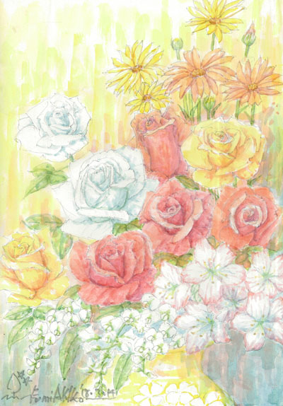 宅下げした絵を二人で見ながら話した。「久しぶりに花を描いてみた」。「バランスがいいね」と私が言うと「バラを中心に、暁子のお父さんが大切にしていたつつじを描き、春が訪れた喜びを表現した。たぶん芦野さんにも評価してもらえると思う。ここを出てからも絵を描きたい。魂が駄目になると絵も駄目になるから、暁子との関係を一番に大事にしたい」 |
