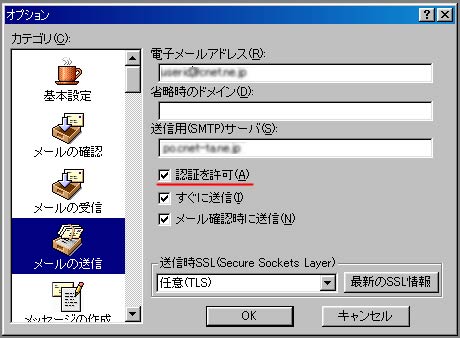 3.カテゴリを「メールの送信」に切り替えて、「認証を許可」をチェックします。(すでに実施済みの方もおります)