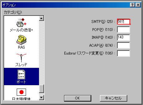 4.カテゴリを「ポート/プロトコル」に切り替えて、「SMTPポート」を587に変更します。
