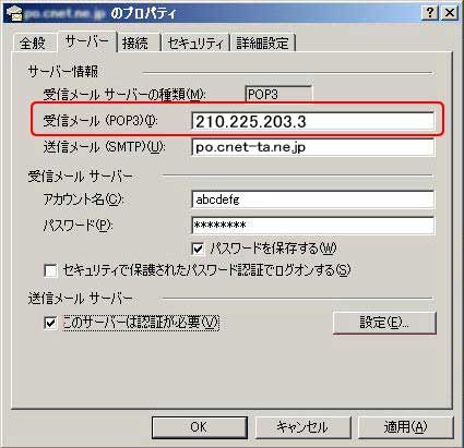 「受信メール(POP3)」を「210.225.203.3」にします。